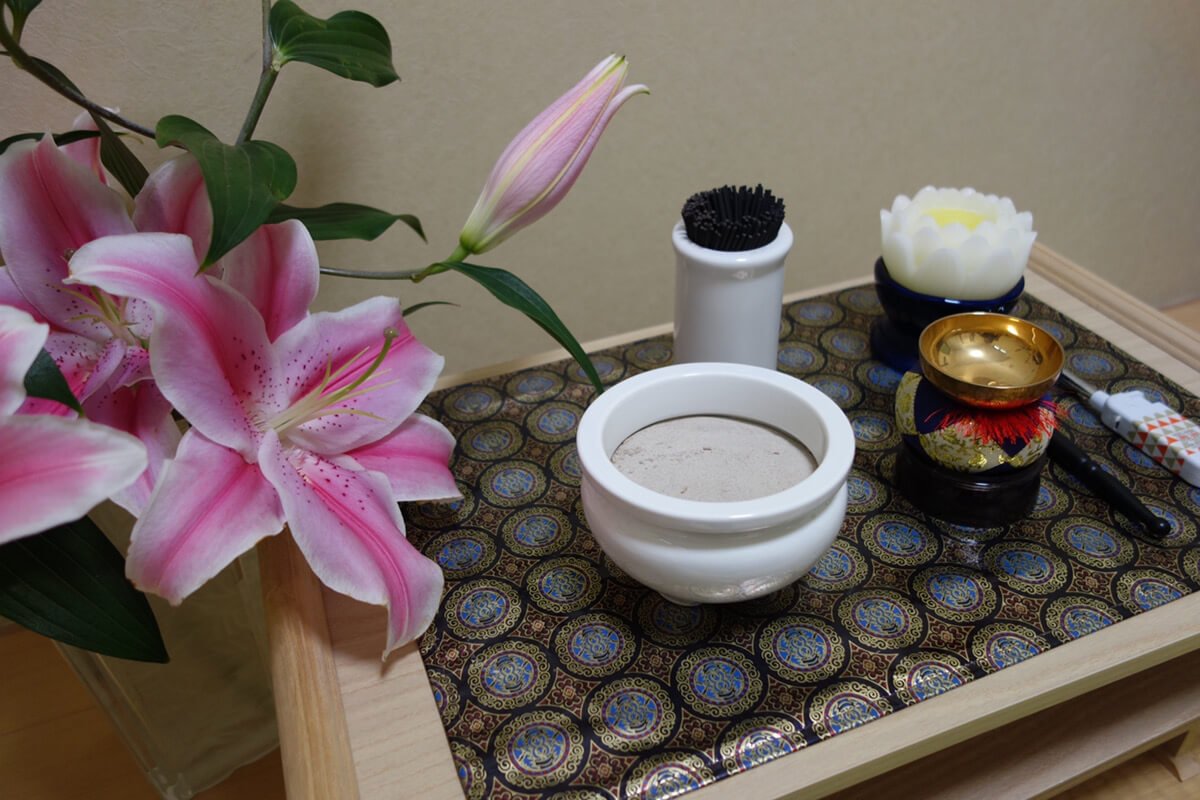 故人が亡くなられてから、お通夜もしくはお葬式までの間、ご遺体を安置しておく時に、枕元に置かれる机および机の上に置かれる仏具を総称して「枕飾り」と言います。